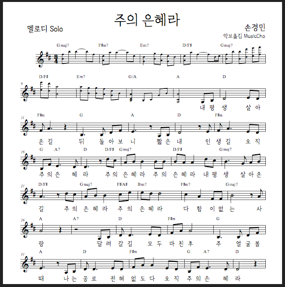 주의 은혜라 악보 가사 D코드 찬양